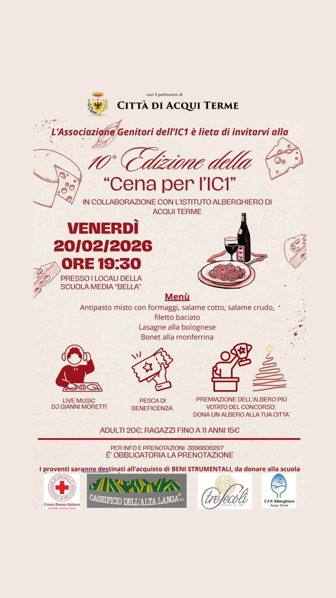10° Edizione Cena per l’IC1 – l’Associazione Genitori IC1 Una serata di gusto, musica e solidarietà – In collaborazione con l’Istituto Alberghiero di Acqui Terme. Menù • Antipasto misto con formaggi, salame cotto, salame crudo, filetto baciato • Lasagne alla bolognese • Bonet alla monferrina. Live Music con DJ Gianni Moretti Pesca di beneficenza; Premiazione dell’albero più votato del concorso “Dona un albero alla tua città”. Adulti 20€ Ragazzi fino a 11 anni 15€ – Prenotazioni Tel. 389 6806297. È obbligatoria la prenotazione. I proventi saranno destinati all’acquisto di beni strumentali da donare alla scuola. Una cena che fa bene… due volte: al palato e alla comunità! Vi aspettiamo