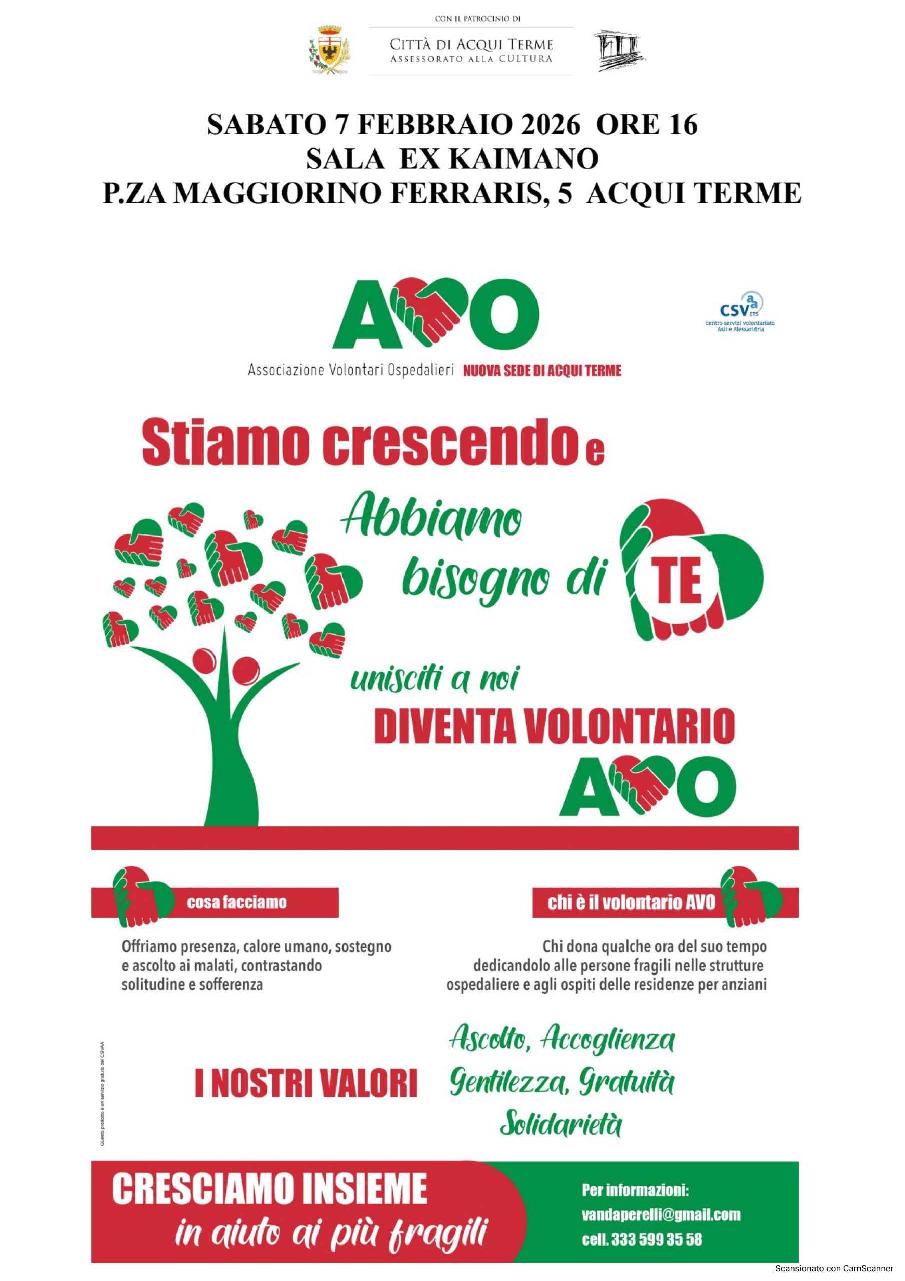 Ricerca volontari per l’Associazione. L’Associazione Volontari Ospedalieri ODV, che opera accanto alle persone fragili dell’Ospedale e agli ospiti delle residenze per anziani del territorio, portando i valori di ascolto, accoglienza, gentilezza, gratuità e solidarietà, in occasione dell’apertura della nuova sede di Acqui Terme, si presenta durante un incontro aperto alla cittadinanza e ricerca nuovi volontari. Dalle ore 16.00 presso la sala ex-Kaimano Diventa volontario AVO! Cresciamo insieme in auto ai più fragili!