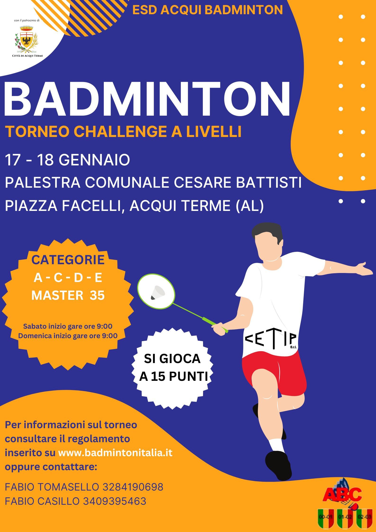 Palestra Comunale Cesare Battisti – Acqui Terme Categorie A – C – D – E Master 35 Inizio gare ore 9:00 (sabato e domenica) Si gioca a 15 punti Regolamento su www.badmintonitalia.it Info: Fabio Tomasello 328 4190698 / Fabio Casillo 340 9395463