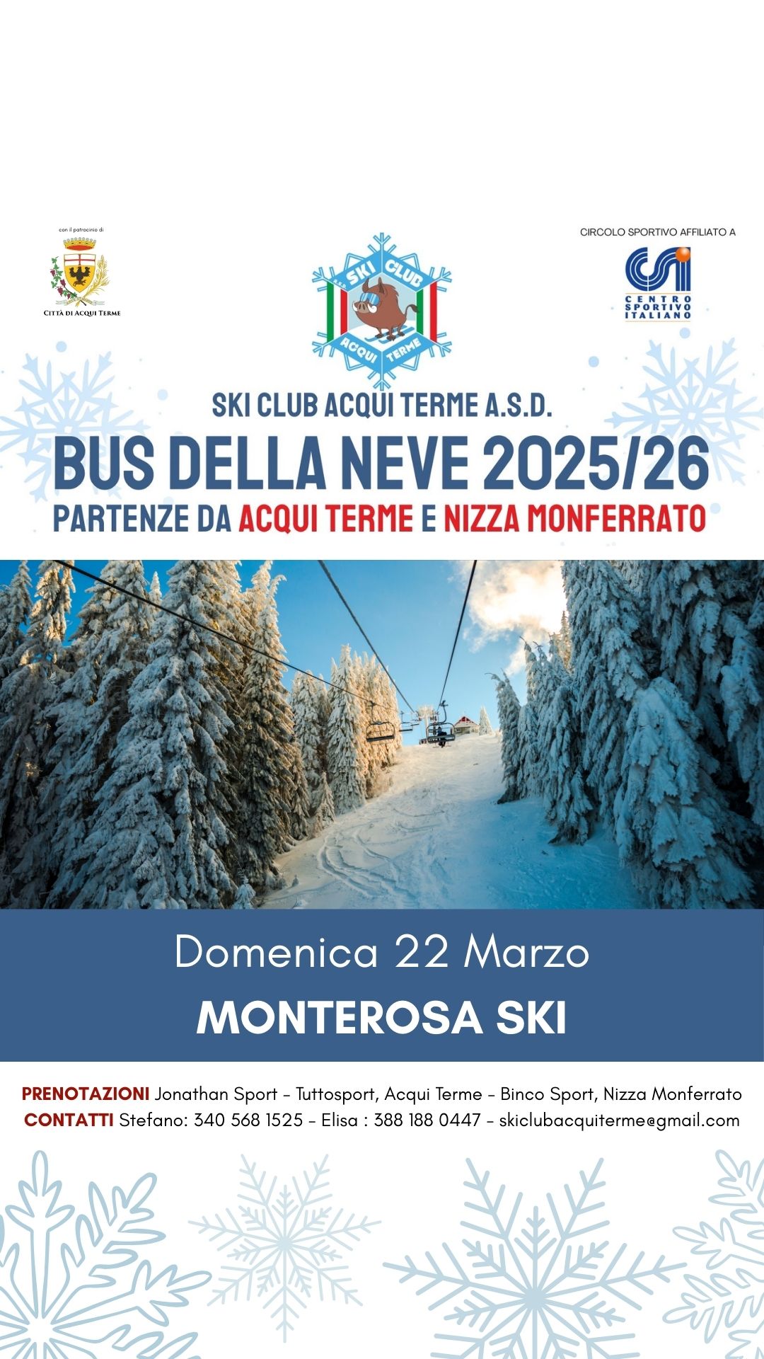 Per prenotazioni Jonathan Sport – TuttoSport Acqui Terme / Contatti Stefano tel. 340 5681525 / Elisa 388 1880447 – skiclubacquiterme@gmail.com