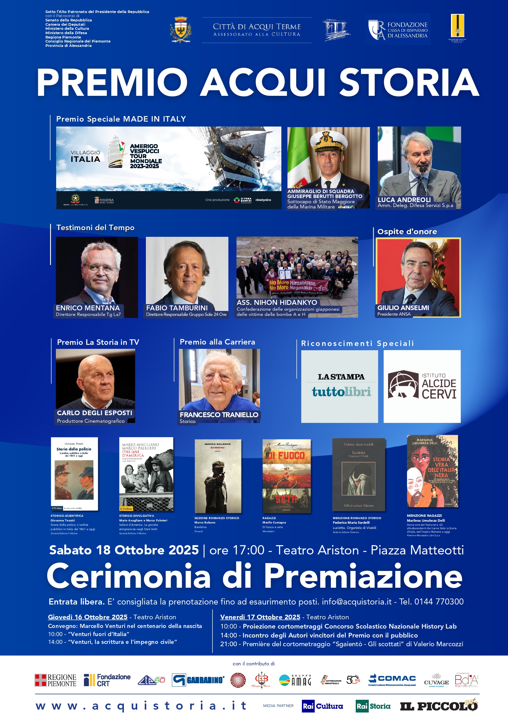 La cerimonia di premiazione della 58ª edizione del Premio Acqui Storia si terrà sabato 18 ottobre 2025 alle ore 17.00 presso il Teatro Ariston di Acqui Terme. Sarà condotta da Roberto Giacobbo, giornalista, docente universitario, conduttore ed autore televisivo di programmi di successo quale “Freedom – Oltre il confine”. Nel corso della cerimonia, accanto agli Autori vincitori delle quattro sezioni e agli Istituti che si sono distinti nel Concorso Scolastico Nazionale History Lab, saranno inoltre consegnati i riconoscimenti speciali “Testimone del Tempo” e “Premio alla Carriera”, tradizionalmente assegnati a personalità che si sono particolarmente distinte nel mondo della cultura, della politica, del giornalismo, dell’arte, della scienza e dello spettacolo ed abbiano, con il loro operato, contribuito ad illustrare in modo significativo gli avvenimenti della storia e della società contemporanea, e il premio speciale “La Storia in TV” attribuito a trasmissioni televisive a carattere storico-divulgativo. PREMIO SPECIALE “MADE IN ITALY”