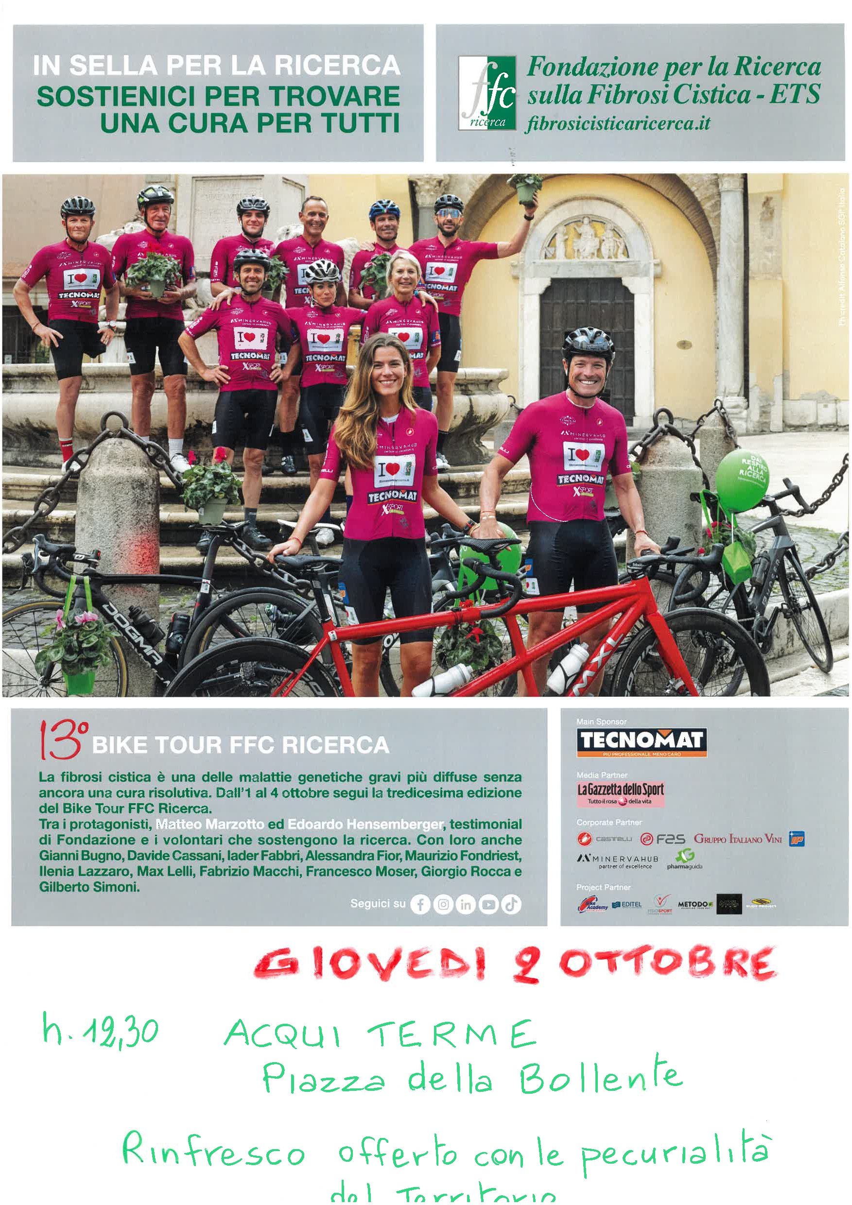 La fibrosi cistica (FC) è una delle malattie genetiche gravi più diffuse e, ancora oggi, senza una cura risolutiva. Il Charity Bike Tour FFC Ricerca nasce nel 2012 da un’idea del Presidente e co-fondatore Matteo Marzotto per sensibilizzare l’opinione pubblica e raccogliere fondi per la ricerca. Grandi campioni dello sport si sono uniti alla squadra negli anni: Bugno, Fondriest, Moser, Simoni, lo sciatore Giorgio Rocca… e tanti altri! Giovedì 2 Ottobre 2025 – Ore 12:30 Piazza Bollente – Acqui Terme Rinfresco offerto con le eccellenze del nostro Territorio ! Unitevi a noi per sostenere la ricerca e vivere una giornata di sport e solidarietà! #CharityBikeTour #FFCRicerca #AcquiTerme #FibrosiCistica #Solidarietà #Ciclismo
