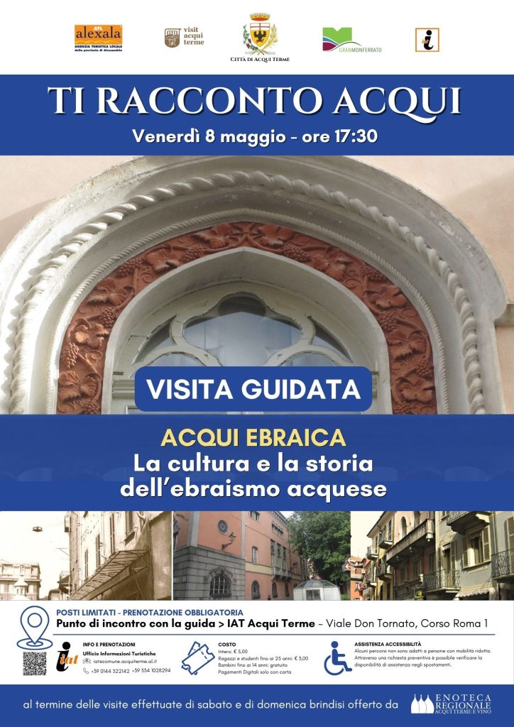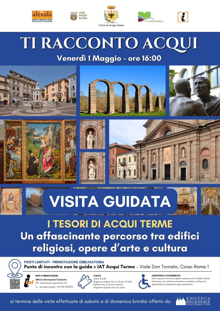 VISITE GUIDATE AL CENTRO STORICO DI ACQUI TERME – CON IL NASO ALL’INSU’ – I Tesori nascosti di Acqui Terme. Suggestivo percorso fra opere d’arte, storia e cultura. Visita ai monumenti principali del centro storico e al termine, alle cantine dell’Enoteca Regionale con brindisi con Brachetto d’Acqui DOCG. PRENOTAZIONE OBBLIGATORIA TEL. UFFICIO IAT – Informazione ed Accoglienza Turistica 0144 322142 / WHATSAPP 334 1028294 Incontro con la guida presso l’ufficio IAT – Viale don Tornato, 1 – Corso Roma ( ingresso laterale del Comune di Acqui T.)