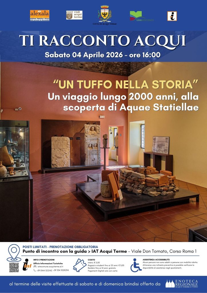 Visite guidate al centro storico di Acqui Terme “UN VIAGGIO ALLA SCOPERTA DELL’ANTICA AQUAE STATIELLAE” – itinerario dedicato ai siti archeologici, spettacoli testimonianze dell’impero romano, come testimoniano gli imponenti resti dell’acquedotto romano lungo il greto del fiume Bormida e il Museo Archeologico sito presso il Castello dei Paleologi, la fontana romana, il sito artigianale di via Cassino e i resti del pavimento a mosaico. La visita si conclude presso le suggestive cantine dell’Enoteca Regionale . PRENOTAZIONE OBBLIGATORIA TEL. UFFICIO IAT 0144 322142 / iat@comune.acquiterme.al.it Incontro con la guida alle ore 16.00 presso l’ufficio IAT – Informazione ed Accoglienza Turistica, viale Don Tornato / Corso Roma – Acqui Terme Prezzo € 7,00 a persona bambini dai 0 ai 12 anni gratis