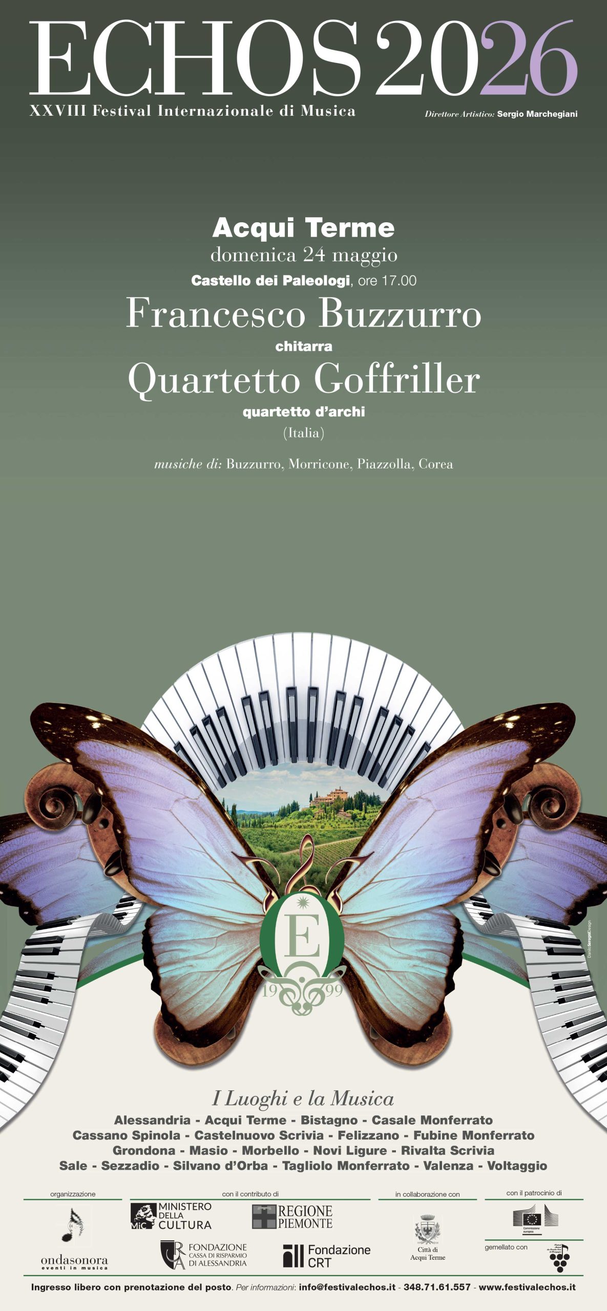 L’edizione 2026 giunge ad Acqui Terme con il concerto per chitarra e quartetto d’archi FRANCESCO BUZZURRO & QUARTETTO GOFFRILLER con musiche di Buzzurro, Morricone, Piazzolla, Corea.