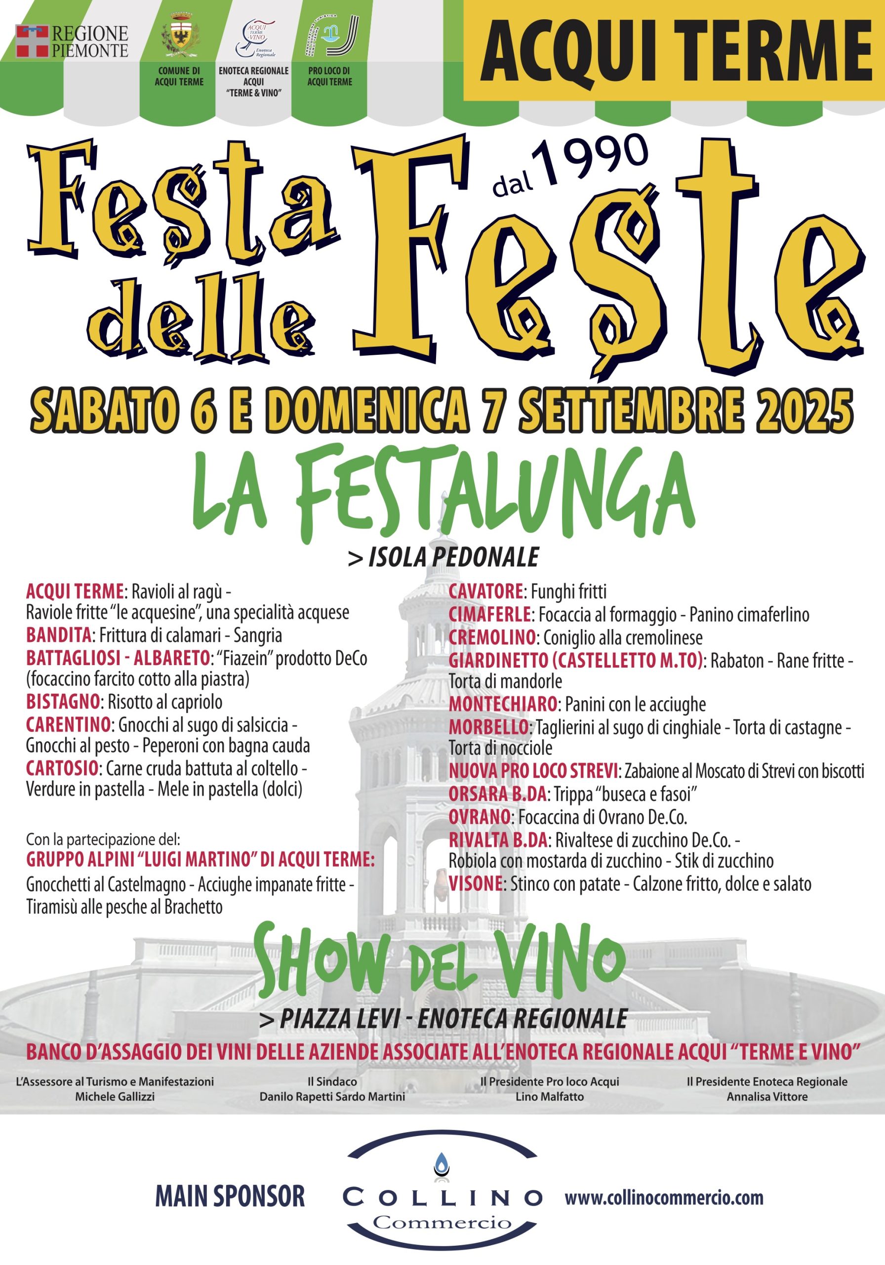 Grande occasione sabato 6 e domenica 7 settembre per vedere all’opera in un unica manifestazione una ventina di proloco locali. La Festalunga che avrà come palcoscenico le vie e le piazze del centro storico per due giorni diventerà lo specchio del mondo agricolo e la vetrina del lavoro. Due giorni in cui le proloco attraverso le loro proposte di carattere enogastronomico, culturale e folkloristico faranno conoscere le tradizioni dei loro paesi. La manifestazione si completa con lo Show del Vino iniziativa che propone la partecipazione tra le migliori aziende produttrici di vini di qualità .