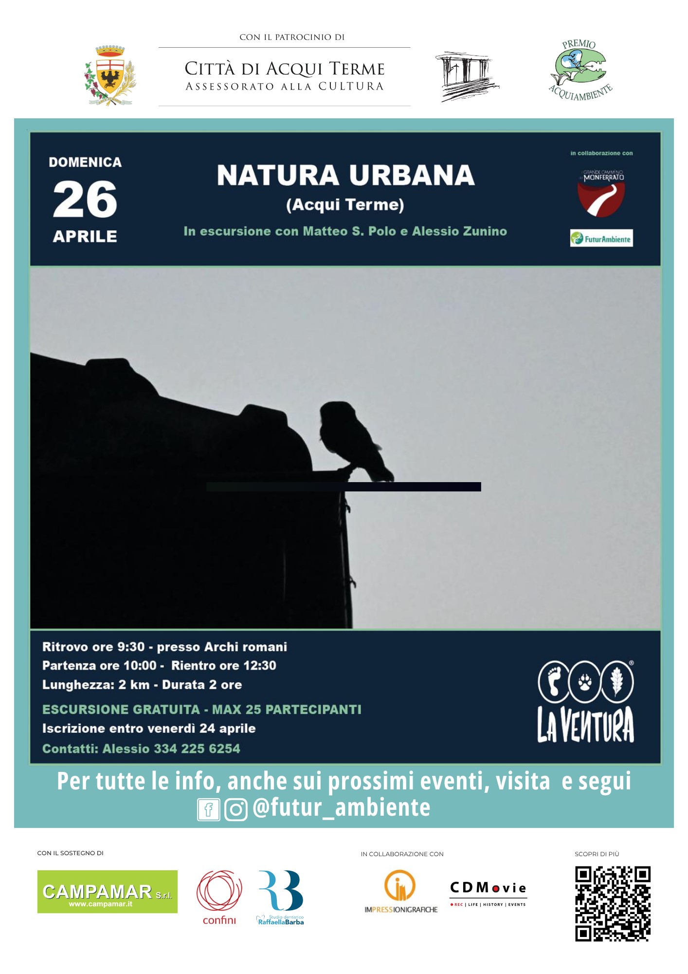 NATURA URBANA – in escursione con Matteo S. Polo e Alessio Zunino. Ritrovo ore 9.30 presso gli Archi Romani – partenza ore 10.00 – lunghezza 2km – durata 2 ore. Iscrizioni entro venerdì 24 aprile tel. 334 2256254. ESCURSIONE GRATUITA – MAX 25 PARTECIPANTI