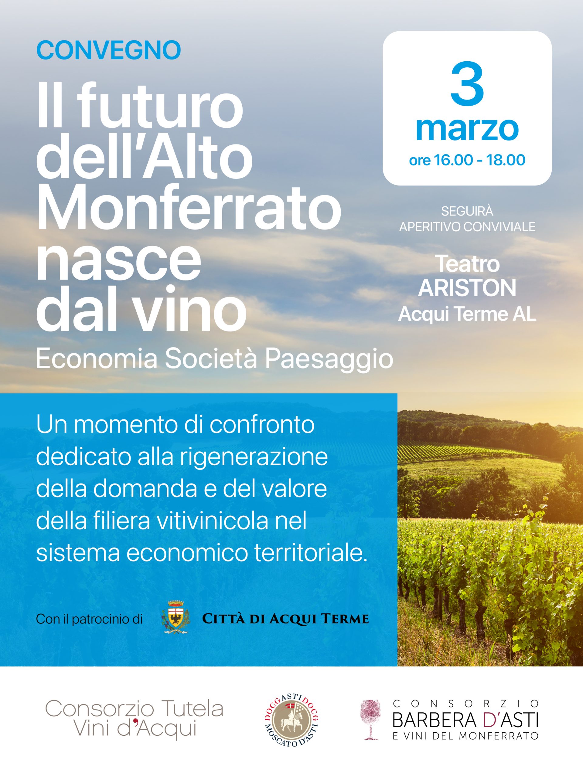 L’iniziativa, patrocinata dal Comune di Acqui Terme, è organizzata dal Consorzio Tutela Vini d’Acqui, dal Consorzio dell’Asti e dal Consorzio Barbera d’Asti e Vini del Monferrato.