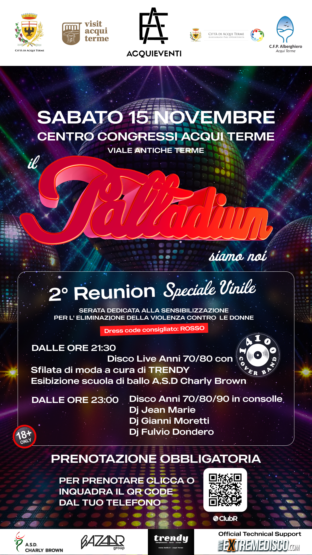 Seconda reunion – speciale vinile – dedicata a rivivere le serate della discoteca Palladium. La seconda reunion dell’iniziativa volge uno sguardo particolare alla solidarietà ed in particolare alla sensibilizzazione contro la violenza sulle donne. Dress code consigliato: rosso. Il programma prevede dalle ore 21:30