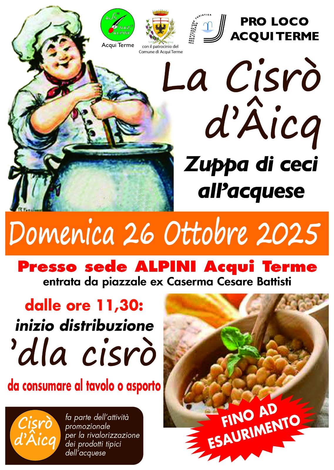 La proloco di Acqui Terme organizza la preparazione e distribuzione della Cisro’: una zuppa a base di ceci piatto tradizionale dell’ acquese.