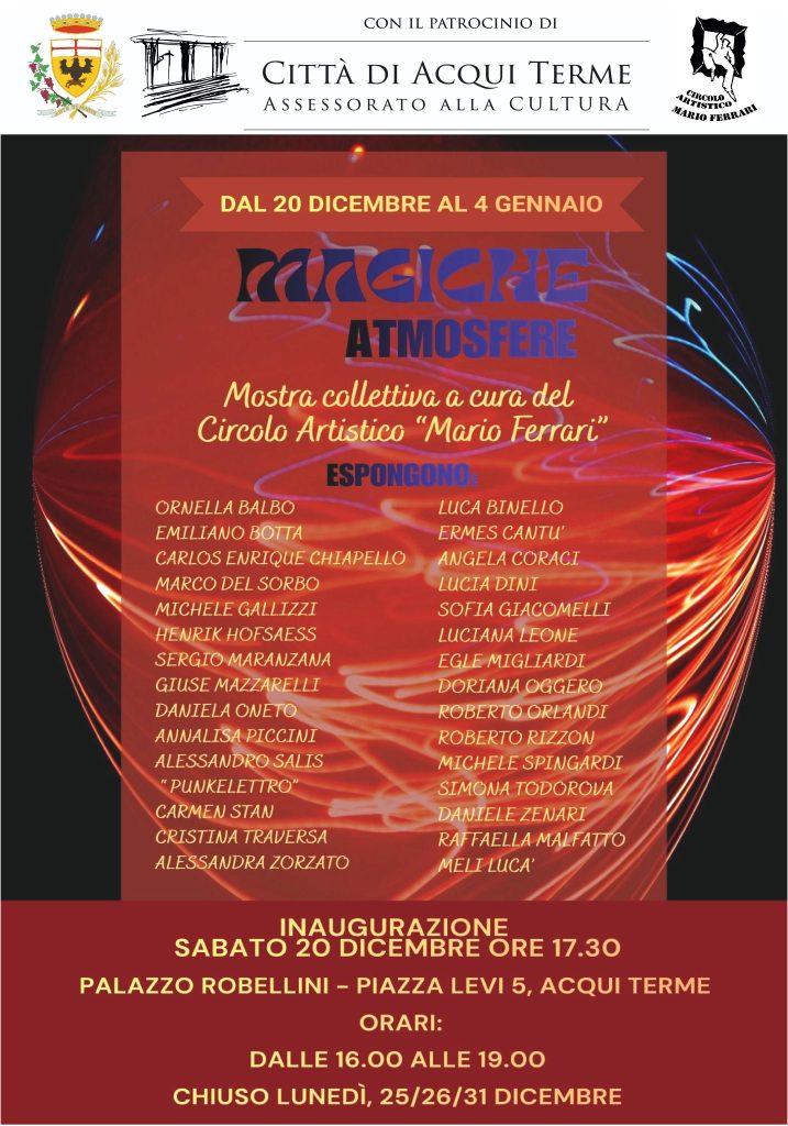 → « Tutti gli Eventi Questo evento è passato. Mostra D’arte CREPE Luglio 19 @ 17:00 – Agosto 3 @ 23:00 Di Serena Baretti ,Artista e Arteterapeuta Inaugurazione sabato 19 luglio alle ore 17:oo Orario di apertura : Venerdi, sabato e domenica dalle ore 17-20 e 21-23 Aggiungi a Google Calendar Aggiungi a iCalendar Dettagli Inizio: Luglio 19 @ 17:00 Fine: Agosto 3 @ 23:00 Categoria Evento: Mostre & Presentazioni Libri Palazzo Chiabrera via Manzoni Acqui Terme, Italy + Google Maps Related Events MOSTRA COLLETTIVA “MAGICHE ATMOSFERE” DEL CIRCOLO ARTISTICO MARIO FERRARI Dicembre 20 @ 17:30 – 19:00 Questo contenuto è disponibile in: Questo contenuto è disponibile in: