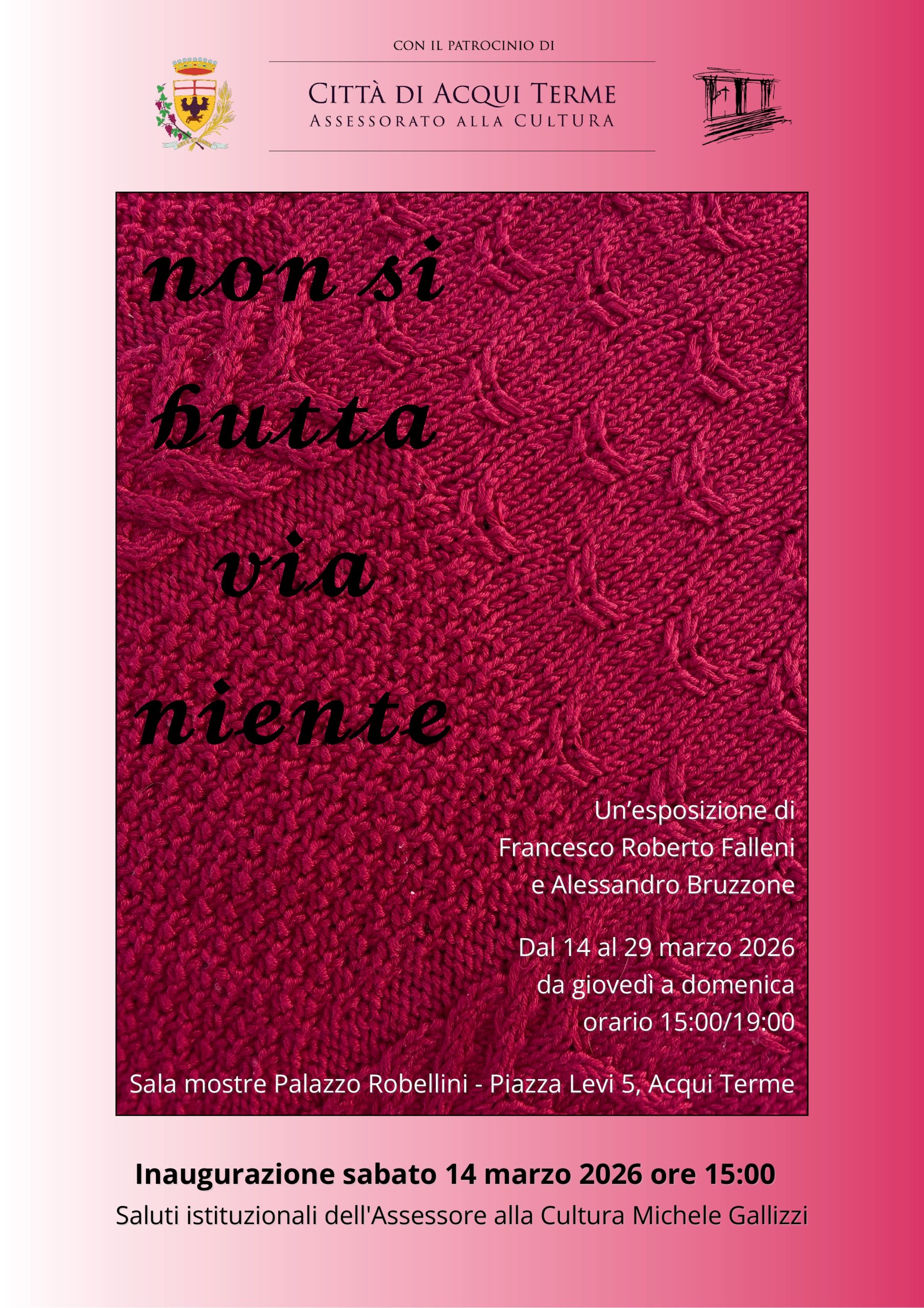 Con la mostra “Non si butta via niente”, Francesco Roberto Falleni presenta una serie di lavori realizzati nell’arco degli ultimi tre anni, in un dialogo costruttivo e insieme provocatorio con le eleganti stanze di Palazzo Robellini. L’artista , traendo il massimo dal materiale che gli sta intorno, utilizza la sua arte come strumento per ricordare, riformulandoli, i simboli, le parole e le immagini ricorrenti delle sue esperienze di vita più dirette, più importanti.