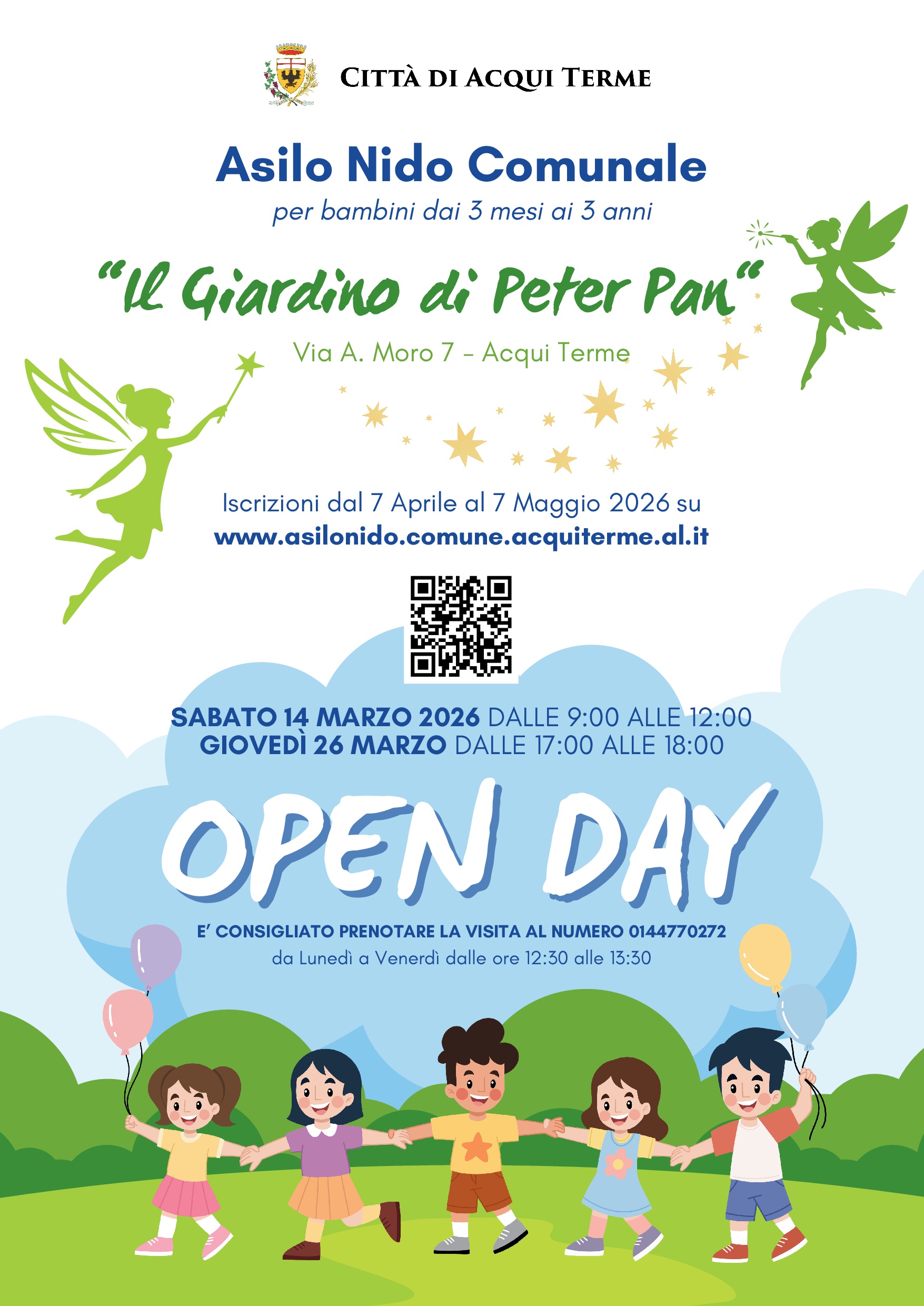 OPEN DAY – dalle ore 17:00 alle 18:00 Un’occasione speciale per visitare gli spazi, conoscere il personale educativo e scoprire il progetto pedagogico del nido. È consigliata la prenotazione al numero 0144 770272 Dal lunedì al venerdì dalle 12:30 alle 13:30 Iscrizioni dal 7 aprile al 7 maggio 2026 www.asilonido.comune.acquiterme.al.it Vi aspettiamo per crescere insieme #AcquiTerme #AsiloNido #OpenDay #IlGiardinoDiPeterPan #ServiziEducativi