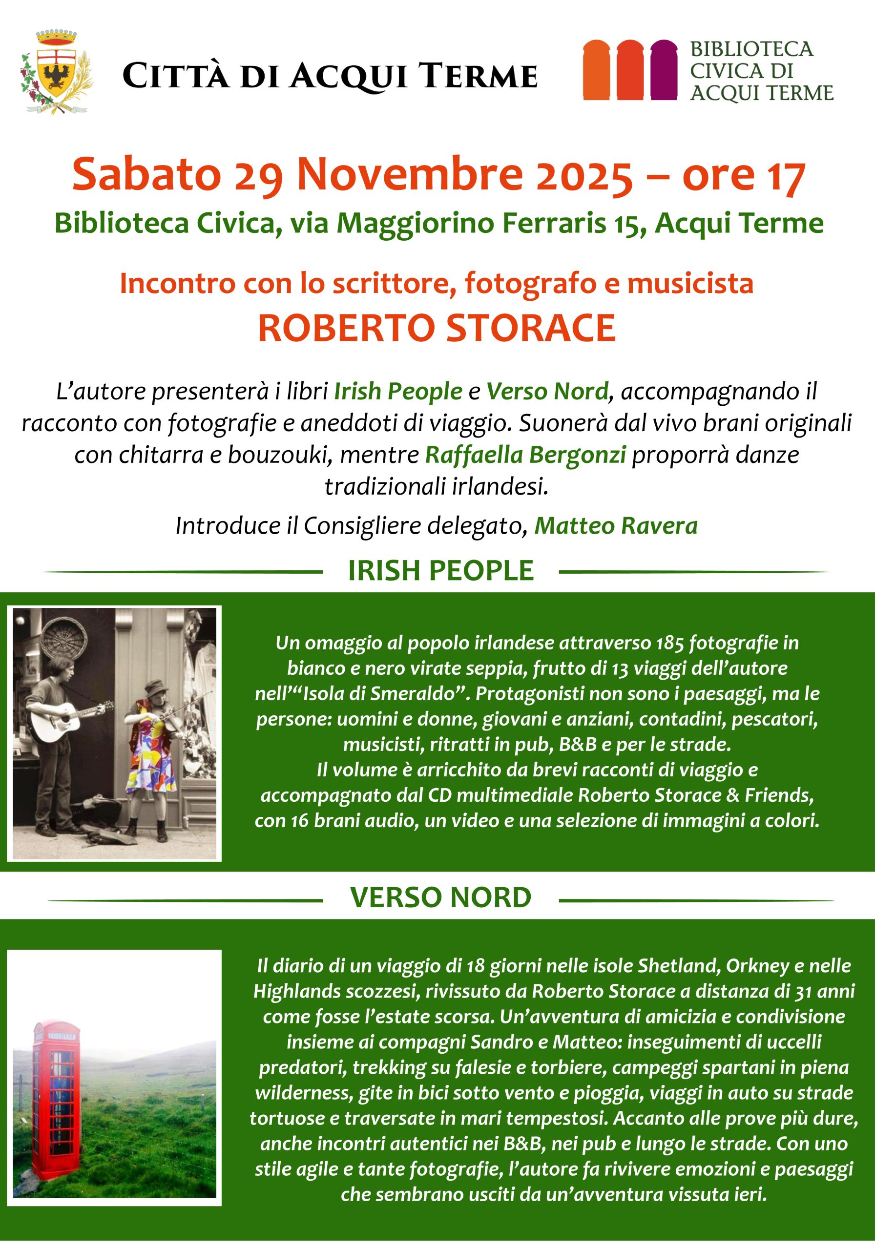 Incontro con lo scrittore, fotografo e musicista Roberto Storace. L’autore presenterà i libri Irish People e Verso Nord, accompagnando il racconto con fotografie e aneddoti di viaggio. Suonerà dal vivo brani originali con chitarra e bouzouki, mentre Raffaella Bergonzi proporrà danze tradizionali irlandesi. Introduce il consigliere delegato, Matteo Ravera.