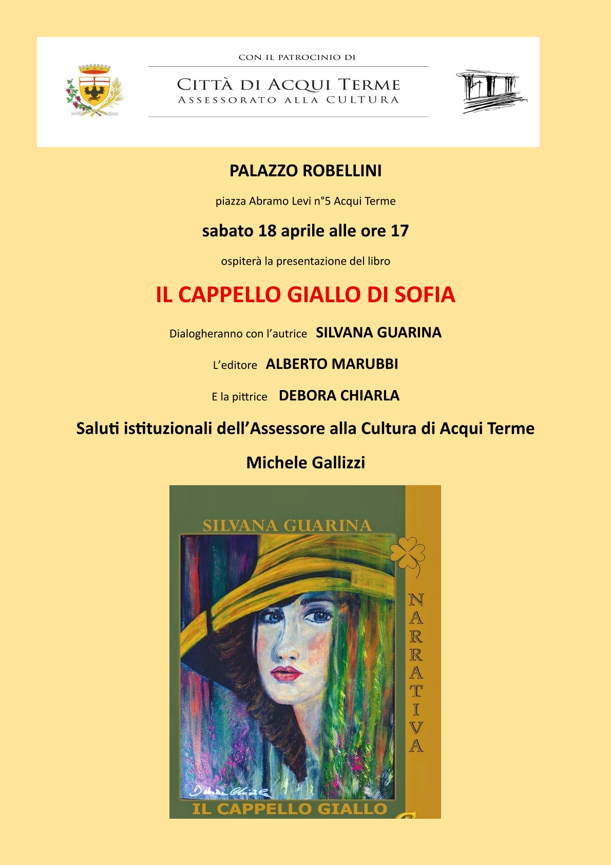 Dialogheranno con l’autrice Silvana Guarina, l’editore Alberto Marubbi e la pittrice Debora Chiarla. Saluti istituzionali dell’Assessore alla Cultura di Acqui Terme Michele Gallizzi. Alle ore 17.00 presso Palazzo Robellini.