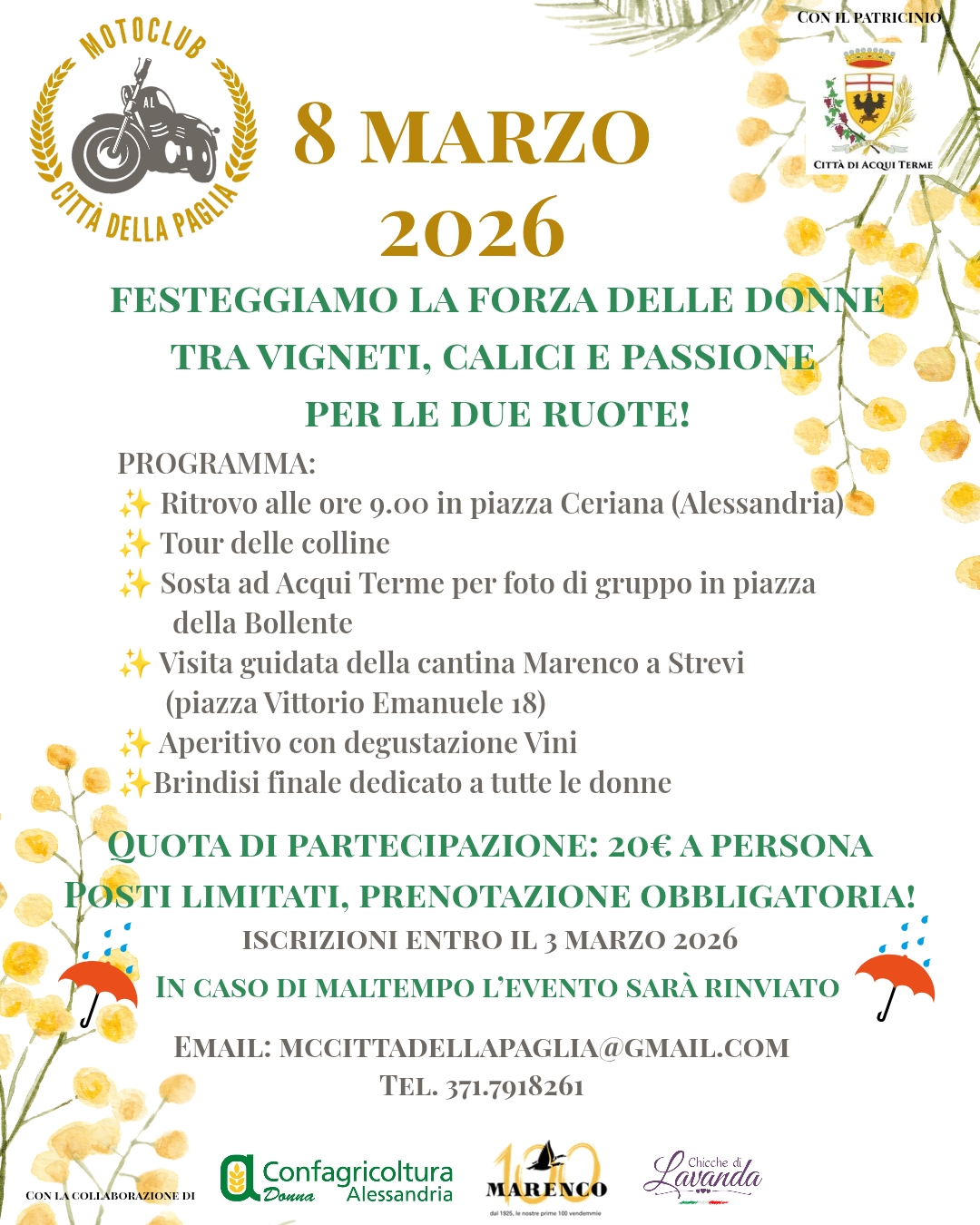 Festeggiamo la forza della Donne tra vigneti, calici e passione per le DUE RUOTE! PROGRAMMA: Ritrovo alle ore 9.00 in piazza Ceriana ad ALESSANDRIA.
