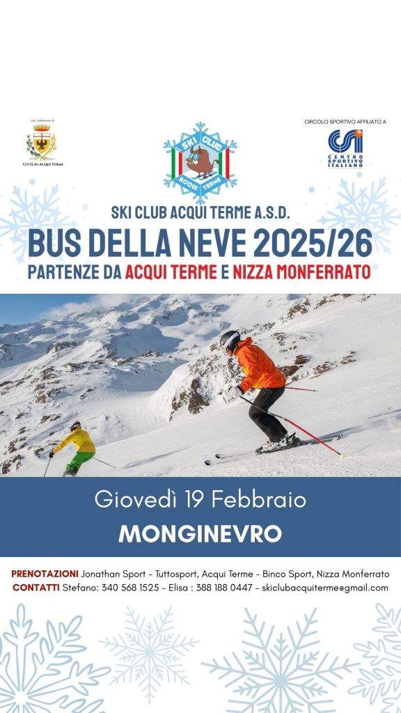 Prenotazioni: Jonathan Sport – TuttoSport Acqui Terme / Contatti: Stefano tel. 340 5681525 – Elisa 388 1880447 – skiclubacquiterme@gmail.com