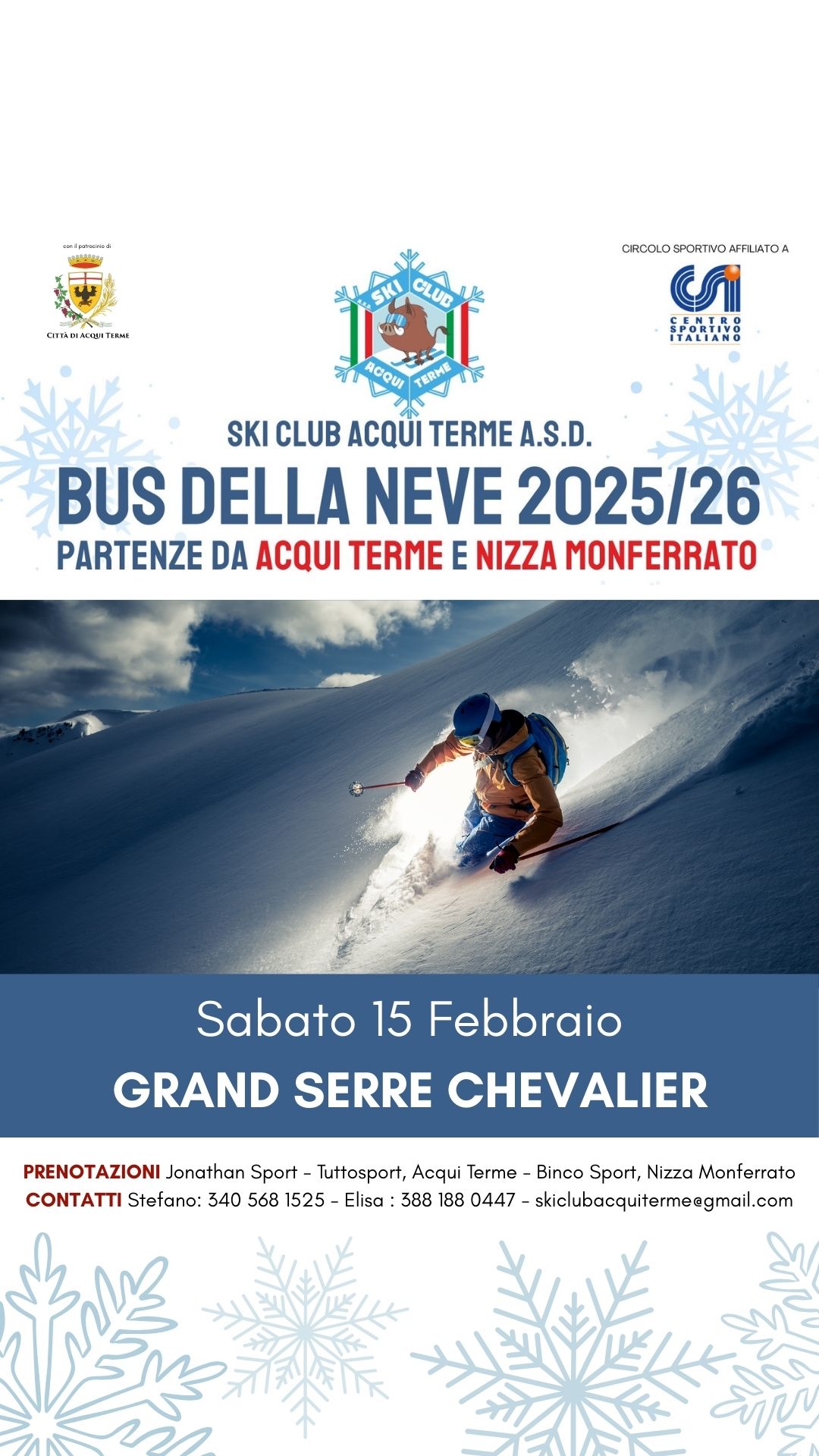 Prenotazioni: Jonathan Sport – TuttoSport Acqui Terme / Contatti: Stefano tel. 340 5681525 – Elisa 388 1880447 – skiclubacquiterme@gmail.com