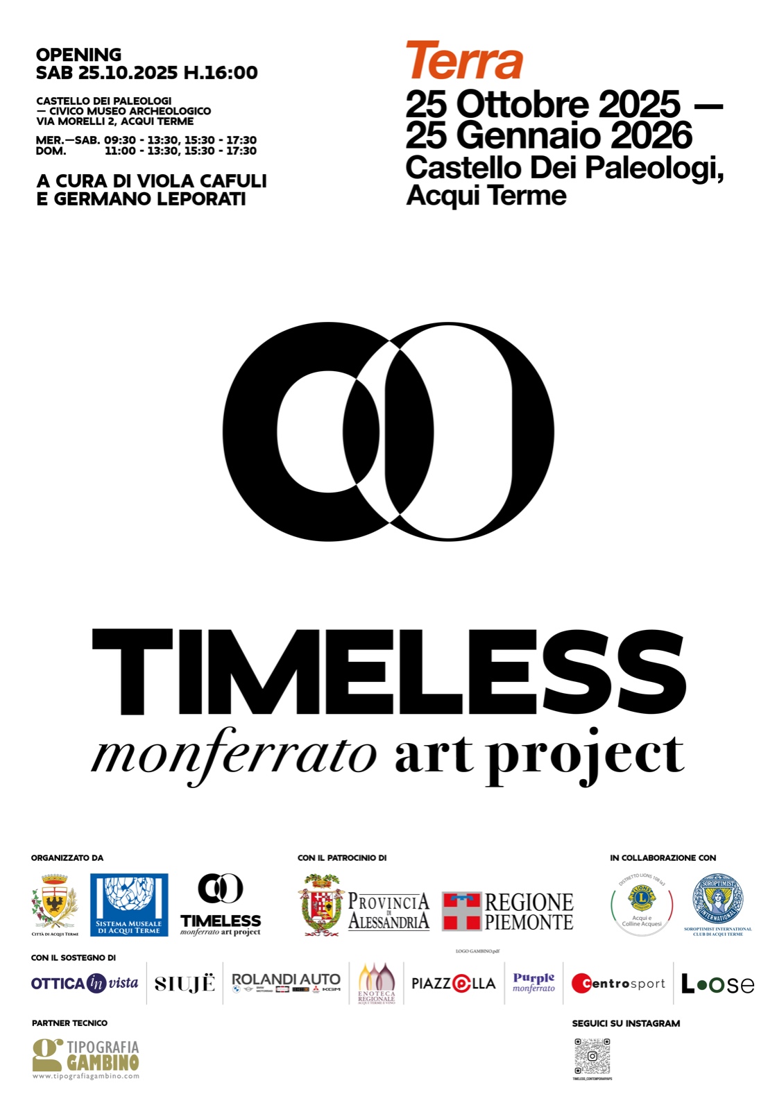 Dal 25 Ottobre 2025 al 25 Gennaio 2026, il Castello dei Paleologi di Acqui Terme accoglie la seconda edizione di TIMELESS MONFERRATO ART PROJECT, a cura di Viola Cafuli e Germano Leporati, trasformando i suoi spazi storici in un palcoscenico per l’arte contemporanea. Un dialogo potente tra memoria e visione, tra il fascino archeologico del castello e le installazioni immersive di Davide Cedolin e Drop Kollektiv, che portano video, suono e luce dentro la pietra, creando un’esperienza sensoriale e intima. Il tema di quest’anno è “Terra”: radice e orizzonte, materia viva e metafora di appartenenza. Timeless trasforma un luogo simbolo della storia locale in un terreno di sperimentazione, dove il passato incontra la ricerca artistica più attuale. Un invito a lasciarsi attraversare dall’arte, in uno spazio che respira insieme al tempo. OPENING SABATO 25 OTTOBRE ALLE ORE 16.00