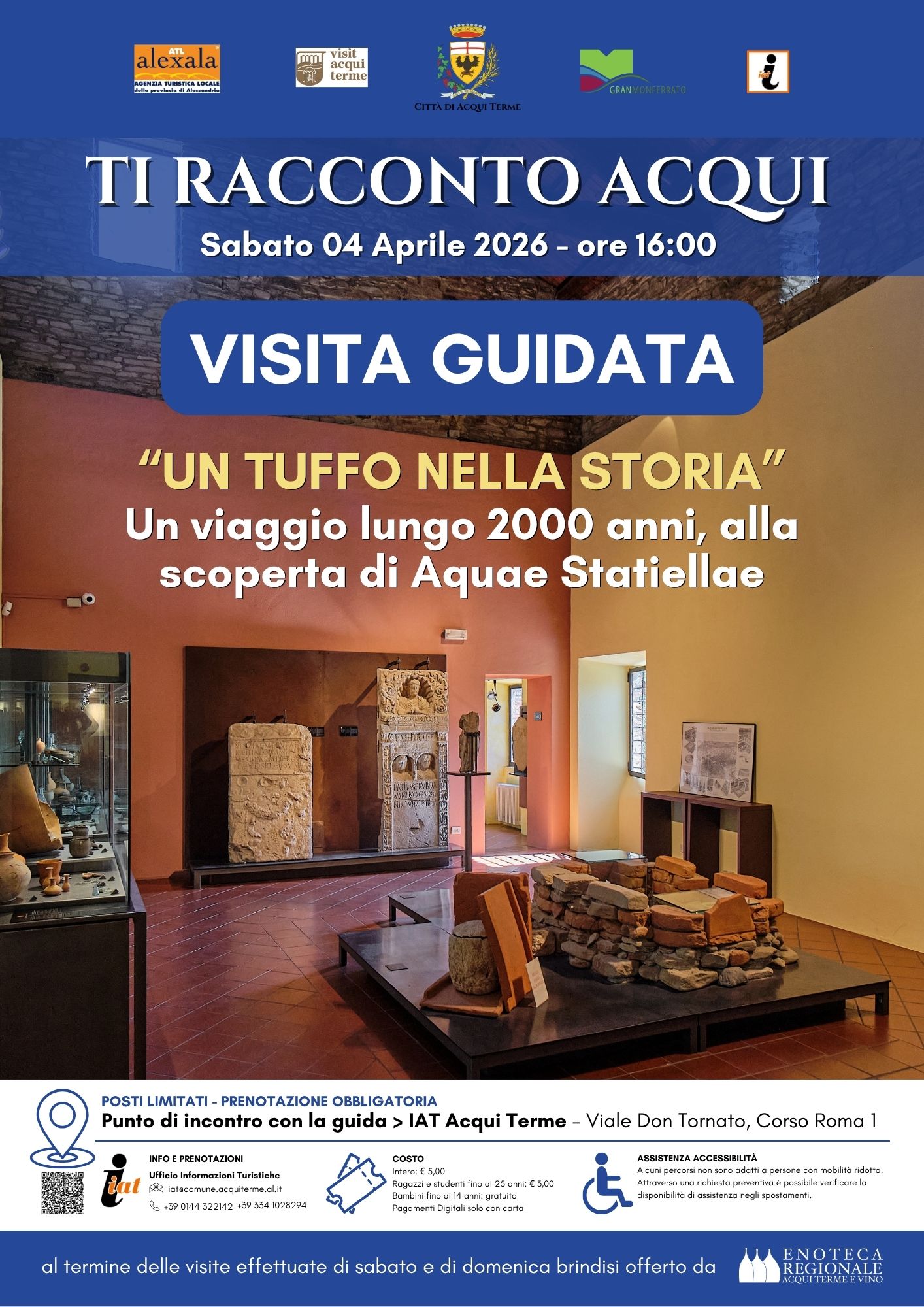 Per informazioni e prenotazioni: iat@comune.acquiterme.al.it / Tel. 0144 322142 whatsapp 334.1028294. Punto di incontro con la guida c/o IAT Acqui Terme, viale Don Tornato, 1 ( corso Roma). Costo intero € 5,00; ragazzi e studenti fino ai 25 anni € 3,00; bambini fino ai 14 anni gratuito. Pagamenti digitali solo con carta.