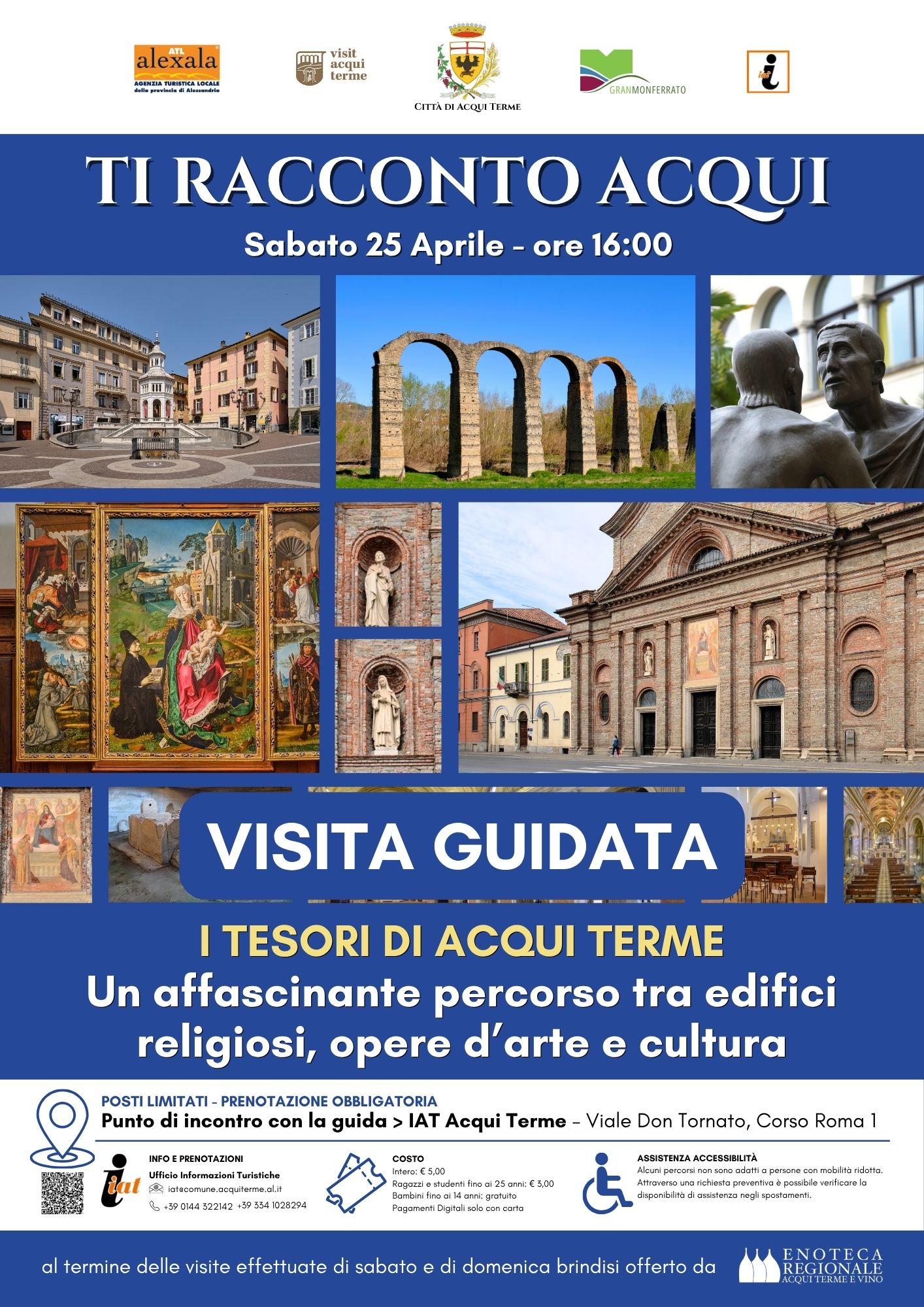 Per informazioni e prenotazioni: iat@comune.acquiterme.al.it / Tel. 0144 322142 whatsapp 3341028294. Punto di incontro con la guida c/o IAT Acqui Terme, viale Don Tornato, 1 ( corso Roma). Costo intero € 5,00; ragazzi e studenti fino ai 25 anni € 3,00; bambini fino ai 14 anni gratuito. Pagamenti digitali solo con carta.