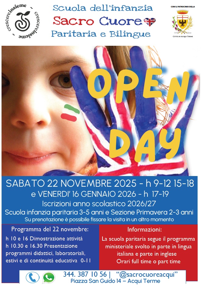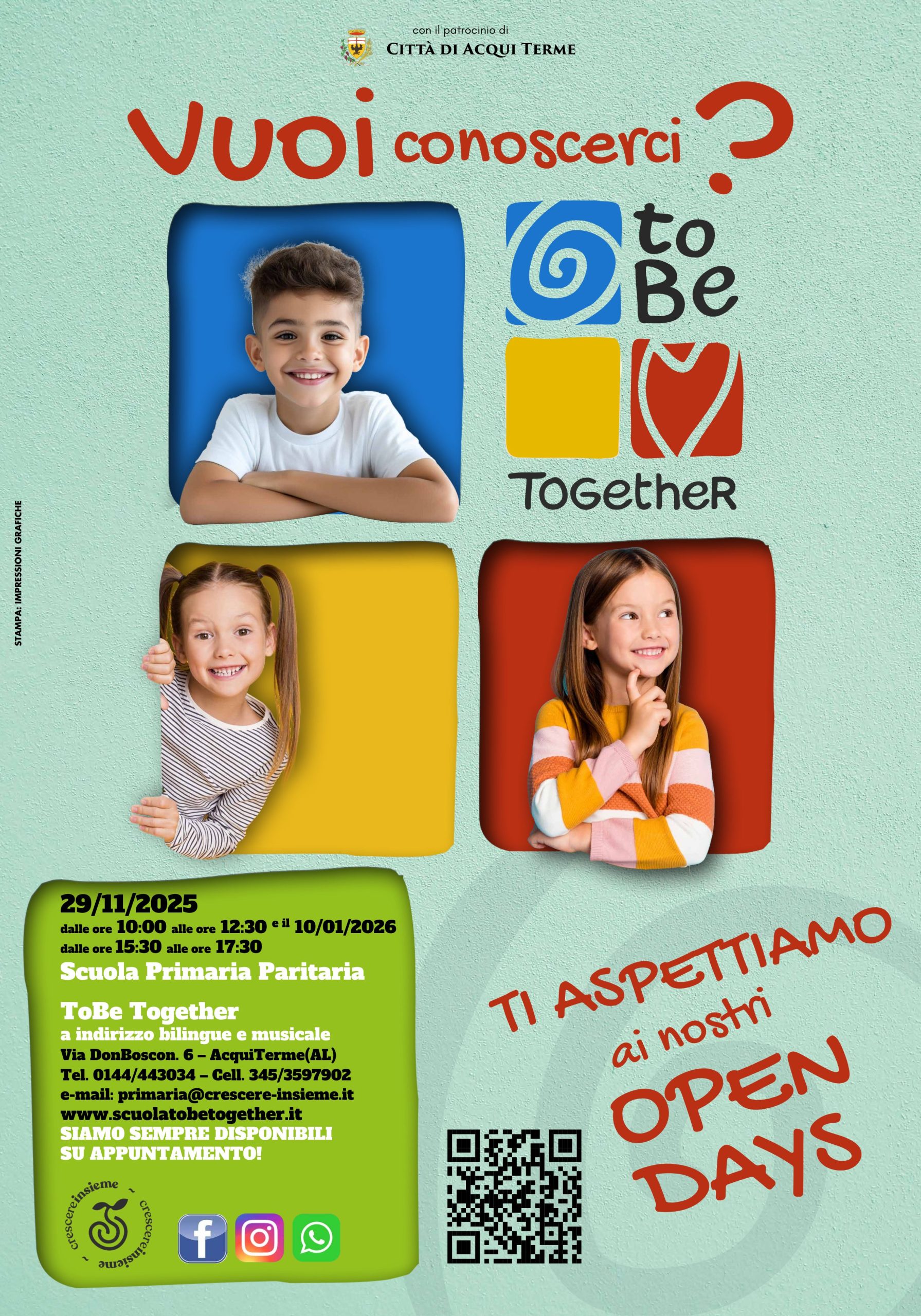 dalle ore 10.00-12.00. Per ulteriori informazioni tel. 0144 443034 / 345 3597902 – primaria@crescere-insieme.it – www.scuolatobetogether.it